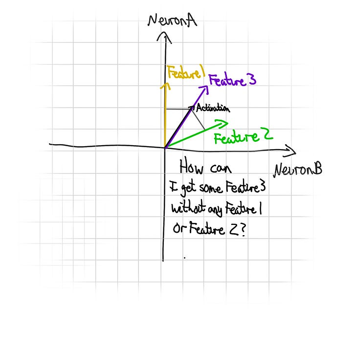 If neurons A and B also have superposed features for different contexts, this creates a knot of combinations which is very difficult to pick into.